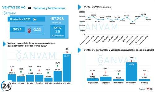 Descenso del 2,2% en ventas de coches usados en noviembre, se registran 187.208 unidades.